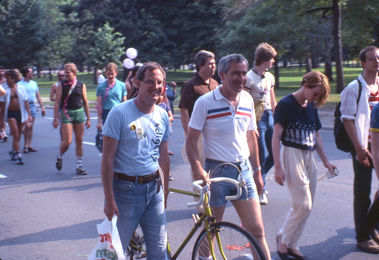 Harvey Hamburg, front and centre, was one of the main speakers scheduled for the day. He'd been a gay activist in Toronto since the mid-1970s, heavily involved in the start-up of a number of community organizations. Since the first story about a rare cancer among gay men appeared in the NY Times in July, 1981, he'd been concerned about a coming health crisis. In early 1983 he'd gone to New York, and alongside Bob Cecchi of New York's Gay Men's Health Crisis, had visited AIDS patients in the city's hospitals. This 1983 Pride Day, Harvey became the first in Toronto to publicly say so when he told the crowd it was time to start using condoms when having anal sex. At this point a number of other AIDS activists considered that an unnecessary and alarmist message and were unhappy with his decision to speak up. But he refused to back down. He repeated the message three days later at the large public information meeting at Jarvis Collegiate called to discuss AIDS. Shortly thereafter those who had been opposed came to see the wisdom of his public statements.